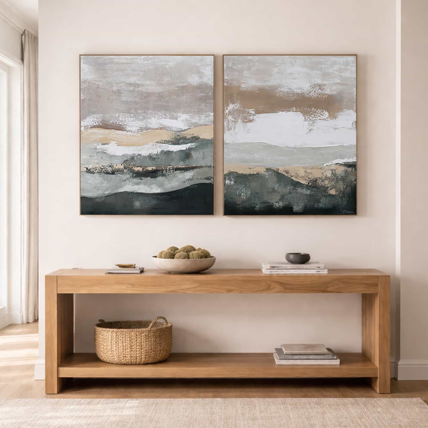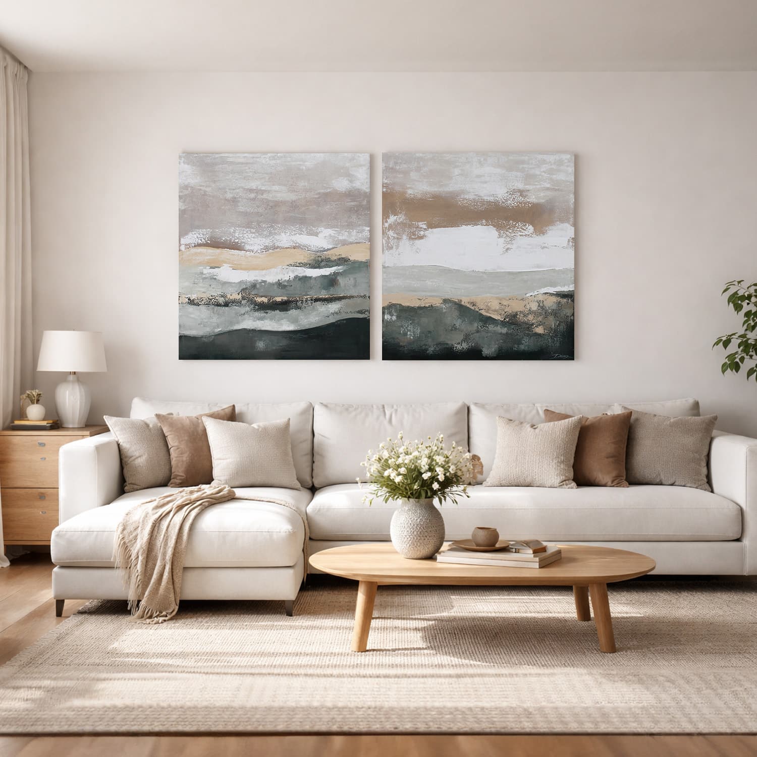 Bring serenity and sophistication to your home with the LA CALMA set. This pair of abstract canvases combines the strength of deep green with the warmth of ochre tones and the lightness of off-white. A balanced piece, ideal for those seeking contemporary décor inspired by organic, misty landscapes. The decorative frame is not included. The price shown in the drop-down menu includes both paintings.