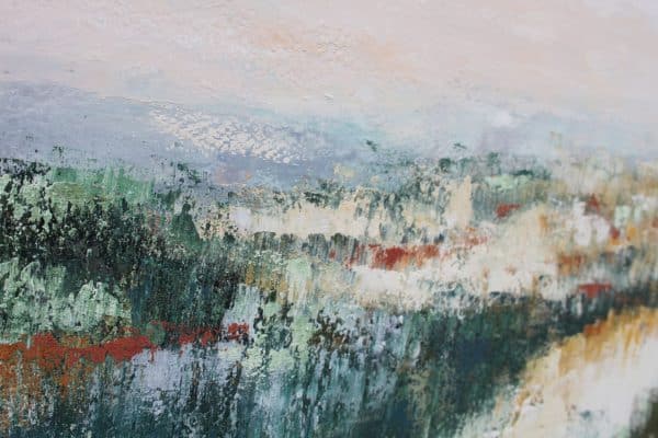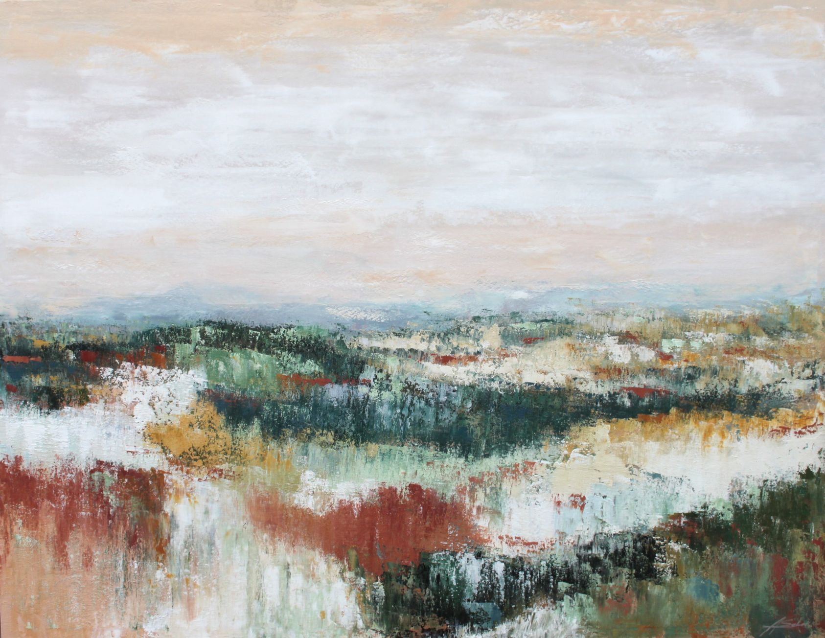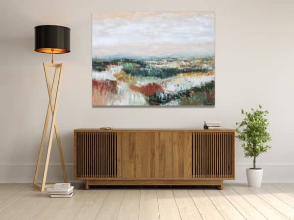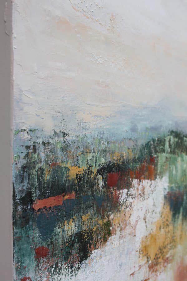 Este cuadro abstracto evoca la riqueza cromática del Campo de Montiel y la tierra de La Mancha. La obra, pintada a mano, captura la esencia de un paisaje a través de un juego vibrante de tonos tierra, ocres, rojizos (terracota) y verdes profundos del campo.