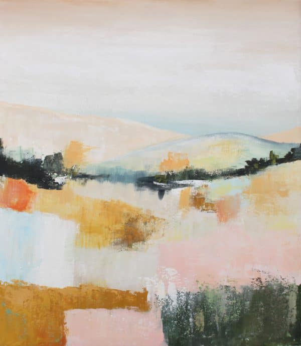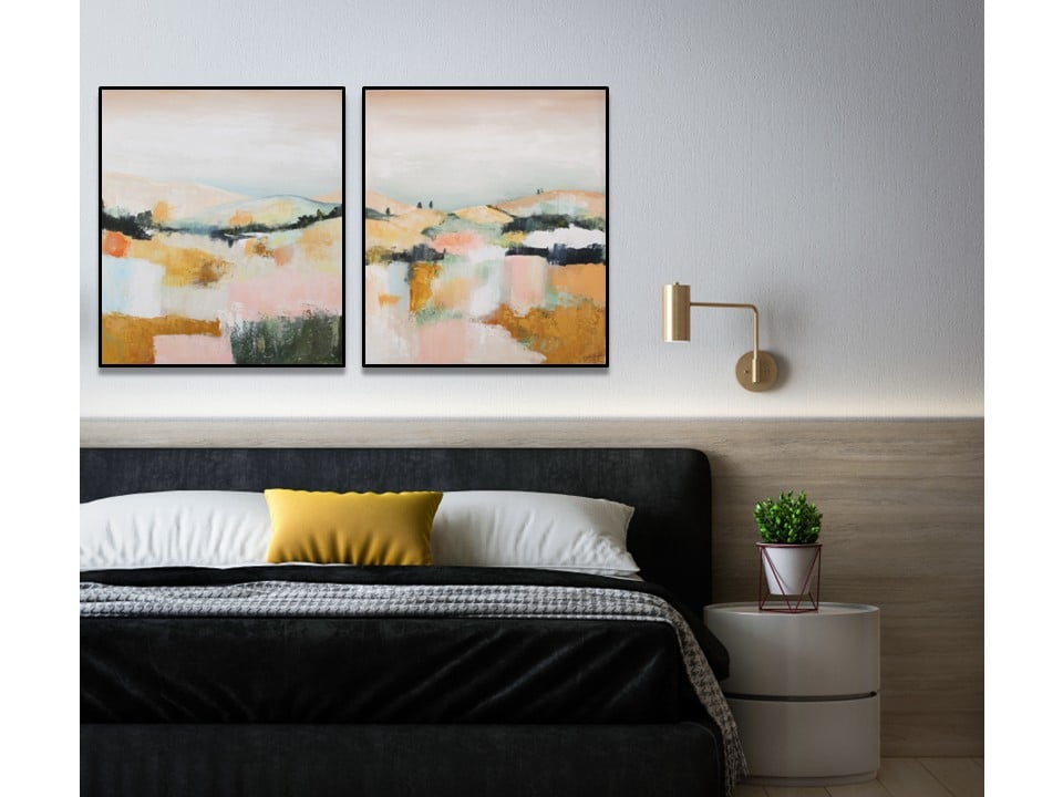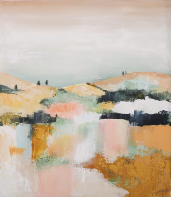 Este cuadro pintado a mano representa una interpretación abstracta y evocadora de un paisaje de la Toscana italiana. La obra utiliza brochazos amplios y sueltos, con colores cálidos y luminosos que evocan la suavidad de las colinas y la atmósfera mediterránea.